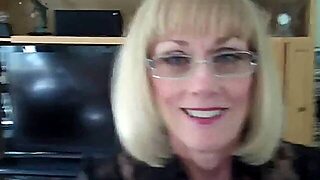 Older blond cum addicted slut Beth lets her lover jerk off onto her floozy face and takes cum in...