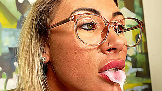Busty milf with glasses blows a big cock